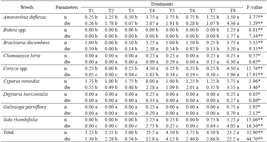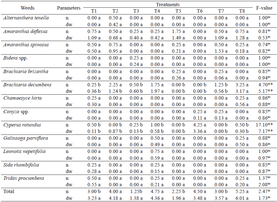 Of the identified species, C. rotundus L. had the highest number of individuals in the treatments without mulching (T4 and T8), regardless of solarization. However, this species exhibited a lower dry weight, when compared to other species with a smaller number of individuals, such as A. deflexus, Conyza spp. and Sida rhombifolia. Bidens spp. occurred only in non-solarized soil with no mulching (T8), while S. rhombifolia was observed in solarized soil without mulching and non-solarized soil with mulching (T4, T5, T7 and T8).