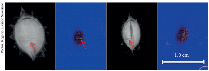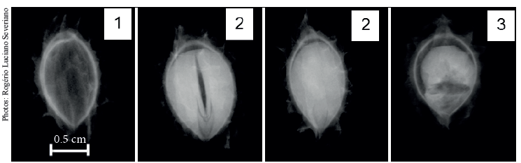From the images of seeds submitted to the X-ray test, it was also possible to identify two seeds with mechanical damage caused by the blender procedure to remove the sarcotesta (Figure 3). Working with soybean seeds (Glycine max L.), Flor et al. (2004) also concluded that the X-ray technique was efficient in identifying internal mechanical damages in these seeds, showing that this technique can be tested and used for seeds of different species.