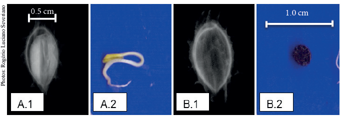 A non-germinated seed can also be observed in Figure 2, which internally was empty (Figure 2B.1), but, externally (Figure 2B.2), it was not differentiated from the other seeds. Identifying empty seeds is very useful to select only the seeds suitable for establishing the stand, thus improving the physiological quality of seed lots (Nunes et al. 2014). In addition, the radiographic analysis in the germination test allowed to identify seeds that could erroneously be considered dormant or dead.