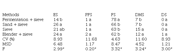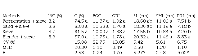 In relation to the analyzed characteristics, only the seedling and root length showed a significant difference among the treatments, and it was possible to observe that the the blender + sieve method promoted a longer seedling length than that using only the sieve, but it did not differ from the other treatments.
