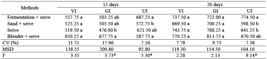 For the growth index, there were significant variations among the treatments only in the seedling evaluation carried out at 15 days, and the procedure that used the blender + sieve provided higher values than that which only used the sieve. This result corroborates that obtained in the physiological characterization of seeds for the seedling length variable (Table 1). This is explained by the fact that the growth index takes into account the relationship between the seedlings of the lot and the maximum size that the seedling can reach in a certain period of time (Kikuti & Marcos Filho 2012).
