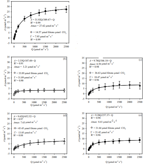 To calculate the apparent quantum efficiency [Φ (µmol CO./µmol fotons)], the concentrations of 0 µmol m-2 .-1, 25 µmol m-2 .-1, 50 µmol m-2 .-1 and 100 µmol m-2 .-1 of photons were used, adjusting the equation . = . + ΦQ, where . and . are coefficients and .represents the photosynthetic photon flux density, with . being the inverse of the line angular coefficient. At the intersection of the line in the x-axis, the value for the light compensation point [Γ (µmol m-2 .-1)] was established. The response curve of ., as a function of the photosynthetic photon flux density, was adjusted by the rectangular hyperbola function (. = Amax Q/“a” + Q), where Amax is the CO. maximum assimilation rate, “a” is an adjustment coefficient of the equation and . the photosynthetic photon flux density (Machado et al. 2005).