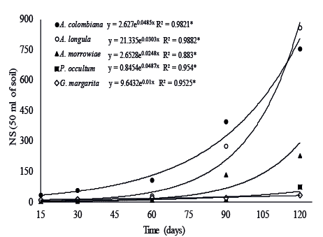 respectively, at 120 days of cultivation, according to the regression equation (Figure 1). The high multiplication potential of A. longulain Urochloa plants is a typical characteristic of this kind of fungus, corroborating results found by Coelho et al. (2014). On the other hand, the lowest spore multiplication was observed for G. margarita and P. occultum, which exhibited, at 120 days of cultivation, 73 and 34 spores, respectively, in 50 mL of substrate (Figure 1). These results suggest that the use of U. brizantha as a multiplier of G. margarita and P. occultum would require a longer cultivation time (more than 120 days), as previously reported for G. margarita and G. gigantea (Oehl et al. 2009, Jiménez-Martínez et al. 2014).