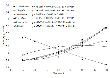 As observed for the multiplication of spores and root mycorrhizal colonization, different AMF species also showed distinct behaviors for increased glomalin concentration during the cultivation time, according to the regression equations (Figure 5), especially for inoculation with the Acaulospora species, with an increase of up to 40 % for A. longula, A. colombiana and P. occultum, and 25 % and 19 % for A. morrowiae and G. margarita, when compared