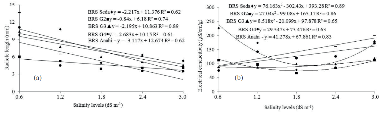 Regarding electrical conductivity, a quadratic equation described the data of seeds of the BRS Seda and BRS G2 cultivars (Figure 2b), and their minimum value was found at soil salinity levels of approximately 2.0 dS m-1 and 1.8 dS m-1, respectively.