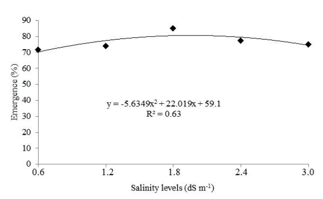 Seedling emergence was only significantly affected by salinity, and its values were described by a quadratic model. The highest percentage of emerged seedlings was found at an ECse of 2.0 dS m-1 (80.6 %), and the values decreased as salinity increased (Figure 3). The average index of seedling emergence speed was 8.5, regardless of soil salinity, and the final percentage was reduced by the higher ECse levels. Thus, seeds produced at higher ECse levels tend to be less vigorous, what may be due to the accumulation of toxic ions, particularly Na+ and Cl- (Souza Neta et al. 2016), causing alterations in the seed biochemical processes.