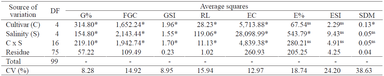 The summary of the analysis of variance for germination, first germination count, germination speed index, radicle length, electrical conductivity, seedling emergence, emergence speed index and seedling dry matter is presented in Table 1. All analyzed variables were significantly affected by the interaction between cultivars and salinity, except for emergence, emergence speed index and seedling dry matter.