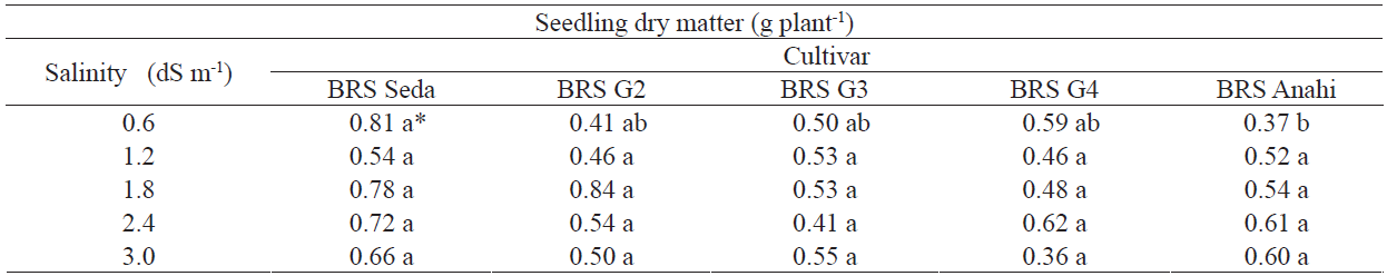 The values for seedling dry matter did not change much among the sesame cultivars at each applied salinity level, except for BRS Anahi, which showed the lowest values of seedling dry matter at 0.6 dSm-1, significantly differing from BRS Seda (Table 2). Such behavior may be considered as a strategy of the seedling to accumulate more reserves at higher salinity levels. According to Silva et al. (2016b), plants at different stages of development, upon exposure to salt stress conditions, tend to use strategies such as the accumulation of reserves to overcome the effects caused by salinity.