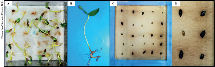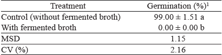 The germination test was carried out in a completely randomized design, with two treatments (with and without application of the fermented broth) and eight replicates of 25 seeds. For this, sheets of filter paper (Germitest.) moistened with 4 mL of the different treatments were used. Then, the boxes were conditioned in a BOD germination chamber at 25 ºC, with photoperiod of 12/12 h of light/darkness. The evaluations were carried out daily until reaching stabilization, counting the number of seeds that germinated, having as a criterion the protrusion of the minimum radicle of 2 mm in length (Brasil 2009).