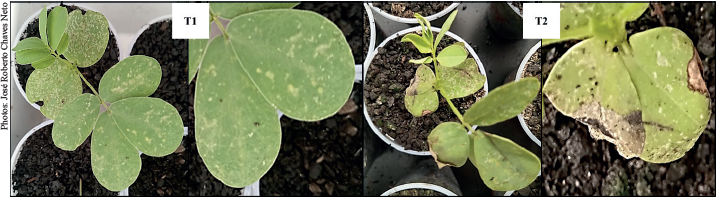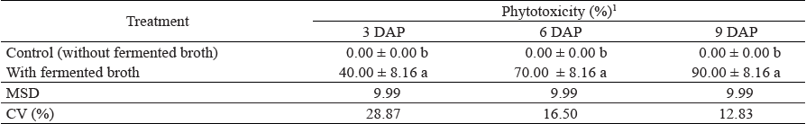 The application of P. dimropha fermented broth resulted in leaf necrosis (30 % of phytotoxicity) of S. obtusifolia plants at 15 days after the application (Table 4and Figure 3). According to Mello et al. (2003), substances which are present in fermented fungi may cause symptoms such as chlorosis, wilt, waterlogging and alteration in plant growth.
