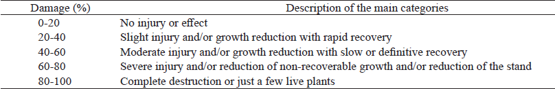 The application of the fermented broth was carried out at approximately 15 days after the emergence of the plants. For the application, a costal/ manual, CO -pressurized sprayer and 300 L ha-1 of syrup volume (Brun et al. 2016), was used. Phytotoxicity evaluations were performed at 15 days after the treatment (Todero et al. 2018b) and the leaf damage to plants was estimated visually, based on the scale presented in Table 1. Then, the plant height (mm) and fresh plant mass (g) were also measured. Based on the plant height data, the growth reduction (%) of the treatment with application of the raw fungus fermented broth was calculated in relation to the control treatment (without fermented broth application).