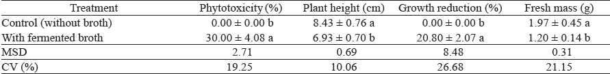 A significant difference (p < 0.05) was observed for plant height with the application of the P. dimorpha fermented broth on S. obtusifolia plants, resulting in a lower height (Table 4). Similar results were observed by Klaic et al. (2017), who found a reduction of 30 % in the plant height of the bioindicator C. sativus, when submitted to the same fermented broth.