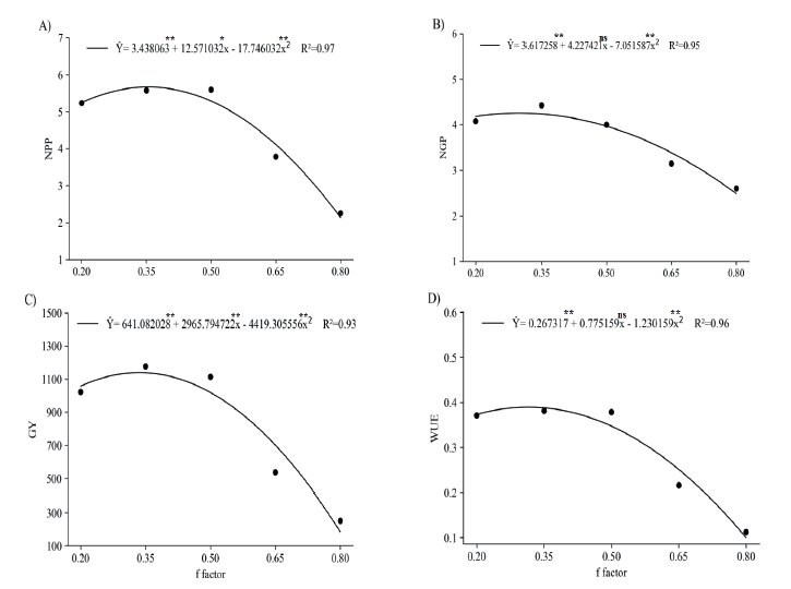The variables data fitted a quadratic regression model. The number of pods per plant, number of grains per pod, grain yield and water-use efficiency (Figures 2A, 2B, 2C and 2D) decreased sharply when using . factors of 0.65 and 0.8, which had the largest intervals between irrigations and lower water depths (Table 2). The maximum number of pods per plant and number of grains per pod were obtained by using the .factors of 0.35 and 0.30, respectively. Factors lower and higher than these caused a decrease in these variables.