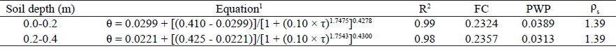 Soil samples were collected from the 0.0-0.2 m and 0.2-0.4 m layers before the implementation of the experiment to characterize the physical-hydrological properties of soil density and the water retention curve at tensions of 6 kPa, 10 kPa, 33 kPa, 100 kPa, 500 kPa and 1,500 kPa (Table 1).