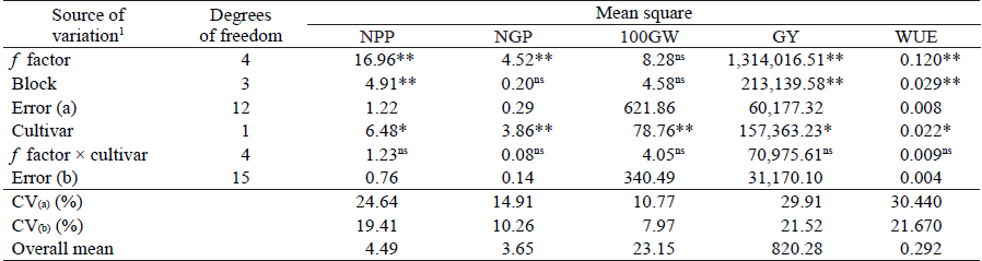 According to the analysis of variance, the interaction between soil water availability levels ( f factor) and cultivars was not significant for any of the evaluated variables (Table 3). The f factors had a significant effect on the number of pods per plant, number of grains per pod, grain yield and water-use efficiency. The cultivars had a significant effect on all the evaluated characteristics (Table 3).