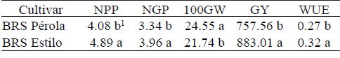 The cultivars had a significantly different water-use efficiency (Table 4). BRS Estilo had a water-use efficiency 15 % higher than BRS Pérola with the same water depths.