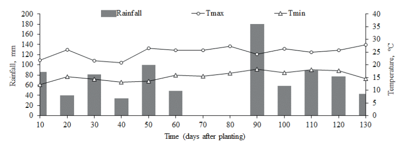 The field study was conducted at the Instituto Agronômico do Paraná experimental station, in Lapa (25º46’11”S, 49º42’57”W and 908 m a.s.l.), Paraná state, southern Brazil. The local climate is classified as Cfb, according to the Köppen’s climate classification, with mild summer and evenly distributed rainfall, no dry season and mean temperature of the warmest month inferior to 22 ºC. The precipitation volume varies from 1,100 mm to 2,000 mm, with the occurrence of severe and frequent frosts in the coldest months. The cumulative rainfall data and average maximum and minimum temperatures during the experimental period (from October 2017 to February 2018) were recorded by a weather station located 300 m away from the experimental plots (Figure 1).