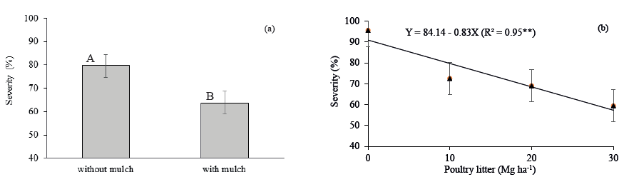 The presence of fresh grass mulch with Elephant grass reduced the late blight severity by 19.9 %, from 79.6 % to 63.8 % for foliar severity (Figure 2a), confirming findings in Europe and in the USA (Nyankanga et al. 2008, Dvorák et al. 2010). A decrease in the late blight severity of 29.6 % (84.1 % to 59.2 %) was also observed with the application of the maximum poultry litter dose incorporated into the soil at the pre-planting stage (Figure 2b). By means of the linear regression, it was observed that 63.8 % of the late blight severity was obtained with fresh grass mulch with the equivalent to 24.5 Mg ha-1 of poultry litter incorporated into the soil at pre-planting.