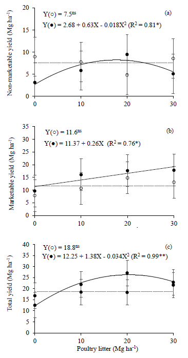 With freshly mowed Elephant grass mulch, the non-marketable tubers (d < 45 mm) increased as a quadratic response (R. = 0.81**) with the poultry litter dose of 17.7 Mg ha-1, resulting in a maximum of 8.2 Mg ha-1 of tubers (306.9 % increase); whereas, without mulch, the poultry litter doses would not affect this result (Figure 3a). These results contradict those obtained by Rees et al. (2014), who observed that the incorporation of poultry litter at the pre-planting stage, during three years, decreased (p < 0.05) the average yield of smaller tubers. Associated to the poultry litter application, non-marketable tubers yields were similar (p > 0.05) between the treatments with and without mulching; but, in the control treatment without poultry litter fertilization, the presence of fresh grass mulch decreased by 5.8 Mg ha-1 (65.1 %) the yield of the non-marketable tubers, in comparison to plots without mulching.