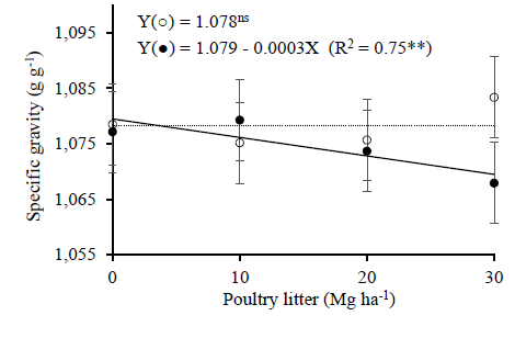 The reduction of the specific gravity, as the poultry litter doses increased only on mulched plots, reinforces the argument that nutrients were more available in this treatment (Figure 4). With 30 Mg ha-1 of poultry litter, the specific gravity of marketable tubers over mulching was 1.4 % higher (p < 0.05) than in the non-mulched treatment. Poultry litter and fresh Elephant grass mulch, as a physical barrier, may have a negative effect on the specific gravity of marketable tubers, due to the avoidance of N and K soil leaching and excessive K supply in both treatments, as this soil is very rich in this nutrient. The effect of poultry manures applied at the pre-planting stage on the tuber specific gravity of potatoes was also observed under non-mulch conditions (Lynch et al. 2008, Rees et al. 2014). Without grass mulch, the specific gravity of tubers did not decrease with the poultry litter doses, due to the leaching of cations through the soil profile, which may also have been favored by the organic fertilizer. According to Gebrim et al. (2008), inorganic anions, such as chloride, nitrate and sulfate, and low molecular weight organic acids, such as malic and oxalic acids, present in poultry litter, help as an ion pair in the leaching of Ca, Mg, K and Na.