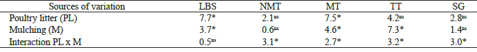 The data were submitted to analysis of variance by the F test at 5 % of significance. The quantitative factors (poultry litter doses) were deployed in plots with and without mulching through polynomial regression analysis at 5 % and 1 % of probability. The difference between the treatments without and with mulching, in the case of significant interactions, was evaluated by the Tukey test (p < 0.05). Pearson’s linear correlations were investigated among the dependent variables of interest. All statistical analyses were performed using the AgroEstat software (Barbosa & Maldonado Júnior 2015).