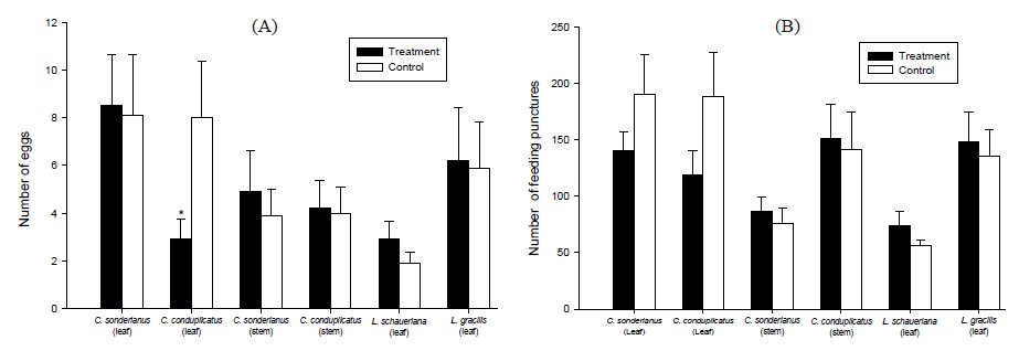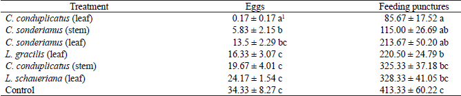 In the no-choice test, the C. conduplicatus leaves also showed the best result, reducing in 20- fold the oviposition, if compared to the control. The C. sonderianus stem EO also caused a reduction in the number of eggs in 5.8-fold. Regarding the feeding punctures, four treatments with EOs presented a lower mean than the control: C. conduplicatus (leaf), C. sonderianus (stem and leaf) and L. gracillis (leaf) (Table 3).