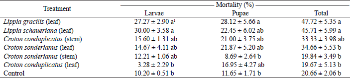 The L. gracilis and L. schaueriana leaves EOs presented an insecticide effect on the L. sativae larval stage, while the treatments composed by the Croton species did not differ from the control. The pupae originated from larvae exposed to L. gracillis EOs also had a lower viability. Considering the overall L. sativae mortality (larvae and pupae), L. gracillisand L. schaueriana reached a mean of 47.72 % and 45.71 %, respectively (Table 1).