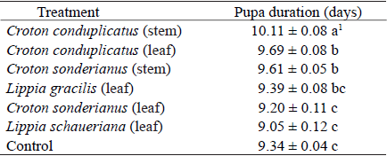 The biological parameters evaluated were larval and pupal mortality and pupal duration. The larvae were daily evaluated using a stereoscopic microscope (40x). The newly formed pupae were transferred to Petri dishes (6 cm ø) coated with plastic film. In this step, the pupal viability and duration were calculated.