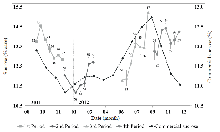 The evaluation took place from September 2011 to December 2012 and was divided into four periods, each with a duration of approximately 3 months, corresponding to the ripening stage of the crop. The crops evaluated during the first and second periods were sampled between 10 and 13 months of age, because the typical harvest time for the sugarcane was approximately 13.9 months. In the third and fourth periods, the crops were sampled between 9 and 12 months of age, because of the decrease in the harvest time selected by the agro-industrial sector for sugarcane. Ripening was monitored in the sugarcane (Saccharum spp.) variety CC 85-92. Other parameters, such as the crop age, harvest date and number of cuts, were kept as similar as possible between the sites to allow for comparisons.