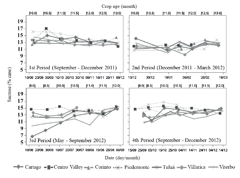 In the second period (December 2011 to March 2012), the localities classified as “semidry” (Cartago and Centro valley), with precipitation lower than the general mean (596 mm), did not show a notable difference in the sucrose (% cane) content, with respect to the “wet” localities (Villarrica, Corinto and Viterbo), where the precipitation was higher. Only Piedemonte was lower than Tulua in sucrose content (Table 1). The sucrose content decreased in all localities during the second period, as compared to the first period (Table 1; Figure 3).