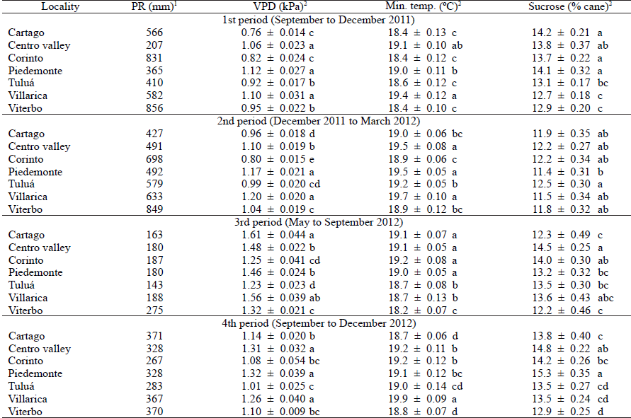 The localities of Cartago, Tulua, Centro valley, Piedemonte, Corinto and Villarrica had a “semidry” condition in the third period (May to September 2012), registering precipitations lower than or equal to the general mean (188 mm). Centro valley and Corinto presented the highest values for sucrose (% cane) concentration, with respect to Cartago and Viterbo (the latter was the only locality with “humid” conditions in this period) (Table 1). In all localities, the precipitation was between 264 mm and 574 mm lower than that in the second period (Table 1). According to Inman-Bamber & Smith (2005), the water stress during maturation enhances the production of sucrose. The vapor pressure deficit values fluctuated between 1.22 kPa and 1.60 kPa during the third period and were much higher (p < 0.05) than those registered during the second period, which ranged between 0.76 kPa and 1.14 kPa (Table 1). Cardozo (2012) observed that the lower rainfall and higher atmospheric demand for water vapor and lower rainfall reduce the water availability in plants, thus stimulating ripening. These conditions, according to Bakker (1999), are optimal for the accumulation of sucrose in the sugarcane stems. The mean minimum air temperature (18.9 ºC) was reduced significantly (p < 0.05) by 0.4 ºC, when compared to that obtained during the second period (19.3 ºC), which favored the accumulation of sucrose in all localities (Table 1). Cock et al. (1993) mentioned that there is an inverse relationship between sucrose and monthly minimum mean temperature.