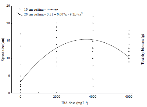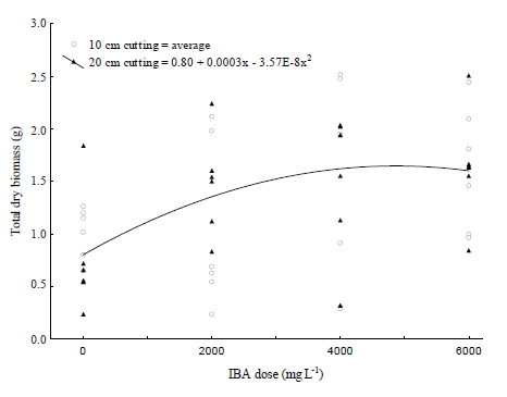 For total dry biomass, the regression model was adjusted between IBA doses with significant effect for 20-cm cuttings. As IBA doses increase, there is an increase in the total dry biomass (Figure 2). Rooting studies generally recommend the use of exogenous auxins in cuttings, as they promote hormonal changes, favoring rooting and increasing root biomass doses showed a higher seedling quality, being more dense and well formed, a desirable characteristic when planting seedlings in the field. The results showed that the application of exogenous auxins to F. chica cuttings increased the growth, quality of the root system and rooting of cuttings.