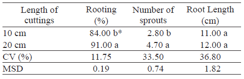 Significant differences were observed for the length of cuttings for rooting and number of sprouts. The rooting percentage was significantly higher for the 20-cm cuttings, when compared to the 10-cm ones (Table 1), which presented 91 % of rooting and a higher number of sprouts (4.7 sprouts cut-1). According to Hartmann et al. (2011), this effect may be explained by the fact that, in general, cuttings of a greater length have a greater amount of reserves, and that the formation of new structures in the shoots of cuttings acts as a drain on the reserves of carbohydrates and nitrogen compounds.