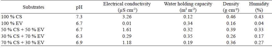 Table 2 shows the values of the chemical and physical attributes of the substrates used in the F. chica cuttings. According to Carvalho (2015), the recommended pH for the cultivation of medicinal plants is between 6.0 and 6.5. In comparison with the values found and excluding the 30 % of cocoa shell + 70 % of expanded vermiculite substrate, it was observed that the pH is above the ideal range; however, it did not prevent the root formation, probably due to the short duration of the experiment (60 days).