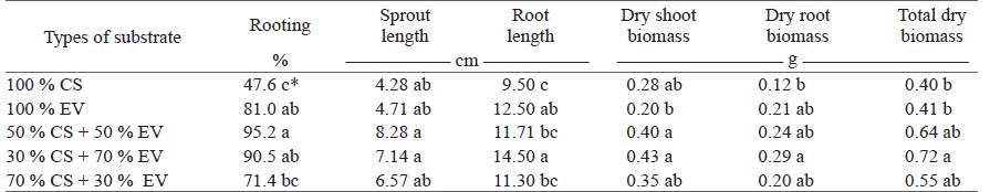 There was an effect of substrates on all analyzed variables, and 50 % of cocoa shell + 50 % of expanded vermiculite substrate had higher rooting percentages (95.2 %) and a longer sprout length (8.28 cm), but did not differ from the 30 % of cocoa shell + 70 % of expanded vermiculite treatment (Table 3). This better performance may be attributed to the greater water holding capacity of vermiculite (0.4-0.5 m. m.³), when compared to cocoa shell (Martinset al. 2011). In this experiment, vermiculite showed a water holding capacity of 0.34 m. m-3 (Table 2), which probably favored the root development and consequently the shoot growth. Silva et al. (2015) worked with Lippia origanoides and found a greater root development and initial growth of seedlings in a treatment using Biomix. commercial substrate + vermiculite at a 1:1 ratio.