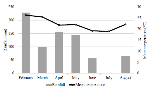 The research was conducted at the Embrapa Agropecuária Oeste, in Dourados, Mato Grosso do Sul State, Brazil (22º16’S, 54º49’W and elevation of 408 m above the sea level). According to the Köppen classification, the climate in the region is Am (Alvares et al. 2013). Rainfall and average temperatures recorded during the experimental period (February to August 2017) are shown in Figure 1.