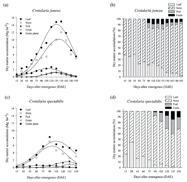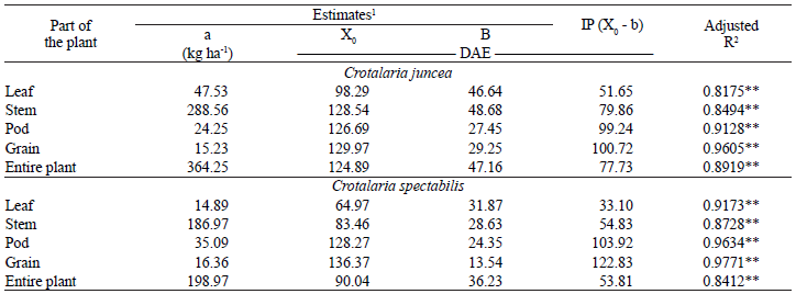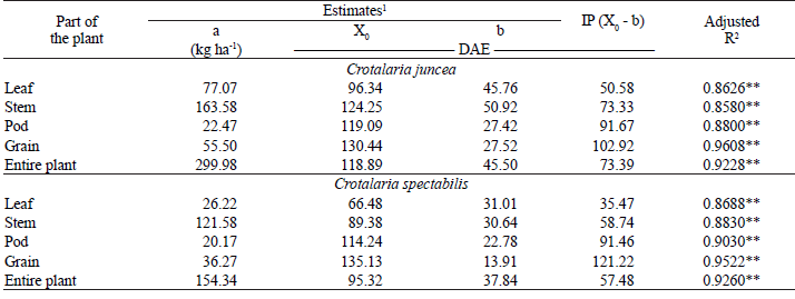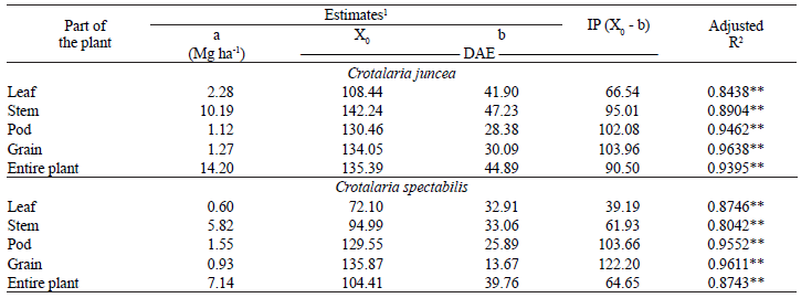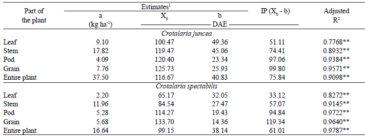 The shoot dry matter production of the crotalaria plants showed a distinct behavior between the two evaluated species. For C. spectabilis, the accumulation was slow until 45 DAE; while, for C. juncea, the dry matter production began to intensify from 30 DAE (Figures 2a and 2c), characterizing it as a more accelerated initial starter species, when compared to C. spectabilis.