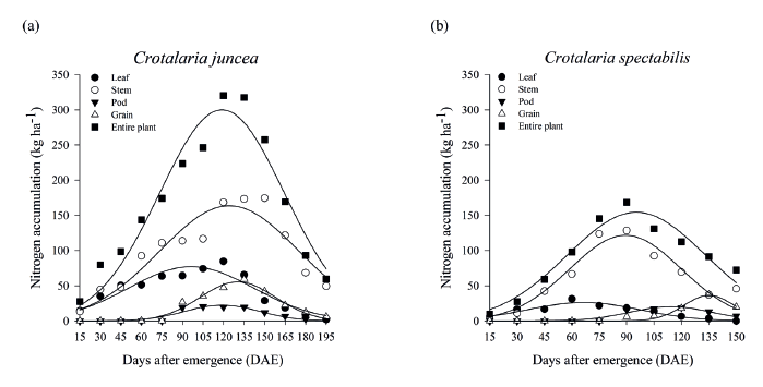 The N accumulation was insignificant until 30 DAE (Figures 3a and 3b), at which point it began to increase, with leaves being the main organ responsible for the nutrient uptake at that time (Figure 3). The maximum N accumulation in the leaves occurred at 96 and 66 DAE, respectively for C. juncea and C. spectabilis (Table 2).