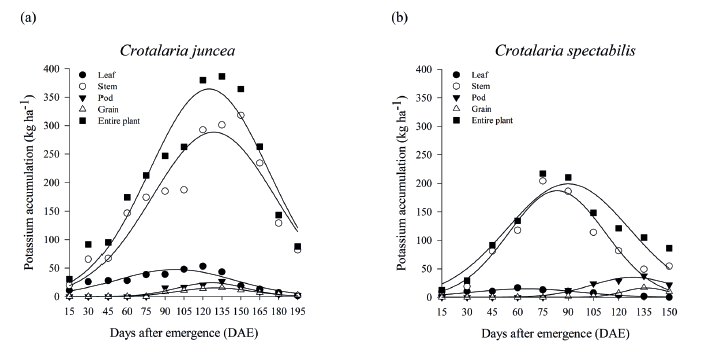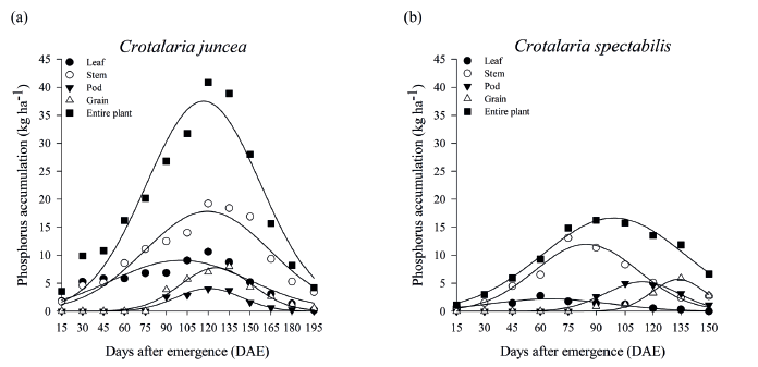The accumulation curves for P (Figures 4a and 4b) show that C. juncea had a greater nutrient accumulation than C. spectabilis for all evaluated structures, except pods, with maximum accumulated amounts of 37 kg ha-1 (C. juncea) and 16 kg ha-1 (C. spectabilis) found in the entire plant at 116 and 99 DAE, respectively (Table 3).