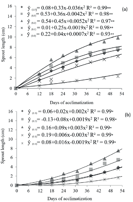 The seedlings treated with BB-16 showed a significant increase (p < 0.05) in sprout length, particularly at a concentration of 0.3 mg L-1, exhibiting sprouts 3 (Figure 1a) to 3.7 times longer (Figure 1b) in the winter and spring/summer, respectively, than the control, after 54 days of acclimatization.