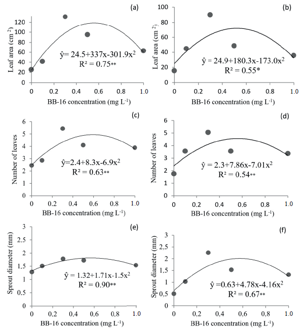 The maximum sprout diameter was obtained at BB-16 concentrations of 0.56 mg L-1 and 0.57 mg L-1, representing increases 1.3 and 4.0 times greater than the controls for plants treated in the winter (Figure 2e) and spring/summer (Figure 2f), respectively.
