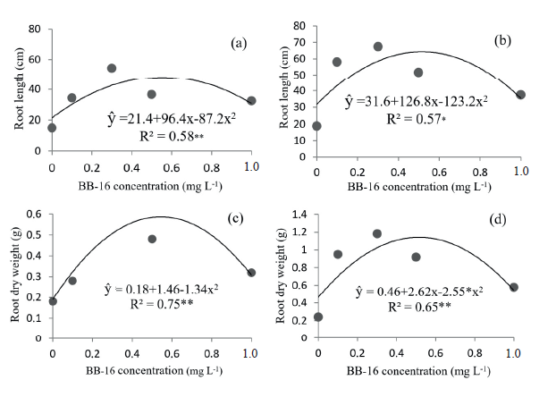 Based on the obtained results, it can be inferred that BB-16 concentrations between 0.3 mg L-1 and 0.6 mg L-1 contributed to the shoot and root growth in BRS Guaraçá seedlings, in both experimental periods (winter and spring/summer).