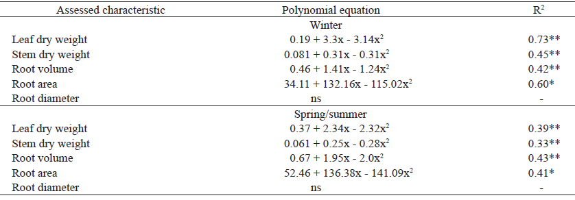The brassinosteroid had a significant effect on leaf and stem dry weight, as well as root volume and area (p < 0.05). The leaf and stem dry weight in plants treated in the winter were 5.9 and 2.4 times higher at estimated concentrations of 0.52 mg L-1 and 0.5 mg L-1, respectively. The root area and volume were 2.2-fold greater at 0.56 mg L-1 and 0.57 mg L-1, respectively. Root diameter was the only characteristic that showed no significant effect (Table 1).