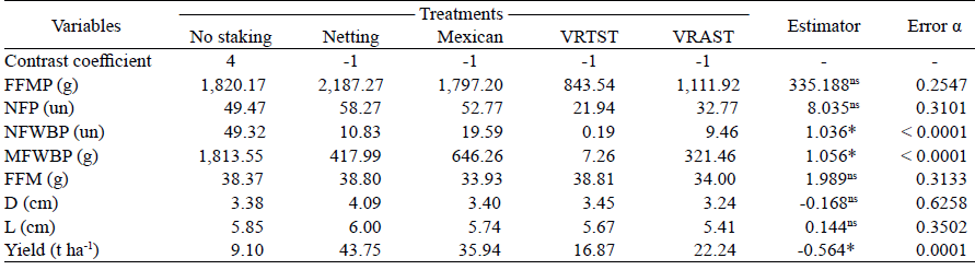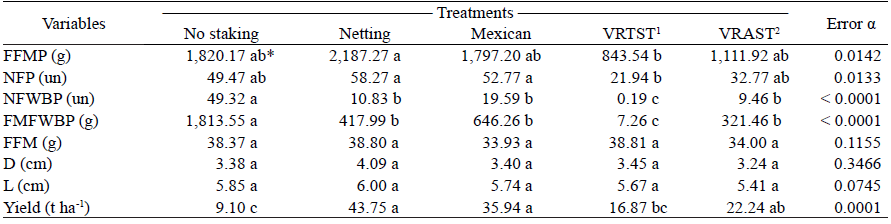 There was a significant difference for the number of fruits and mass of fruits with white belly per plant, with average values for staking treatments lower than those for no staking, and for total yield, where the staking treatments were superior than for no staking.