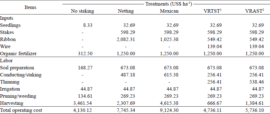 The highest total operating cost was observed for the Mexican treatment. Among the most expensive items, it is worth mentioning the harvest labor. The Mexican system in tomato leads to lodging, caused by the weight of the fruits on the plant (Schmidt et al. 2018). That was also observed in the bur gherkin conduction, making it difficult to observe and harvest the fruits between the plants, because of the presence of small thorns.