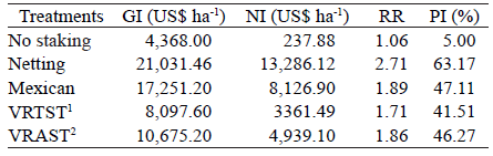 Table 4 shows the economic indicators of the bur gherkin crop cultivated under different staking systems.