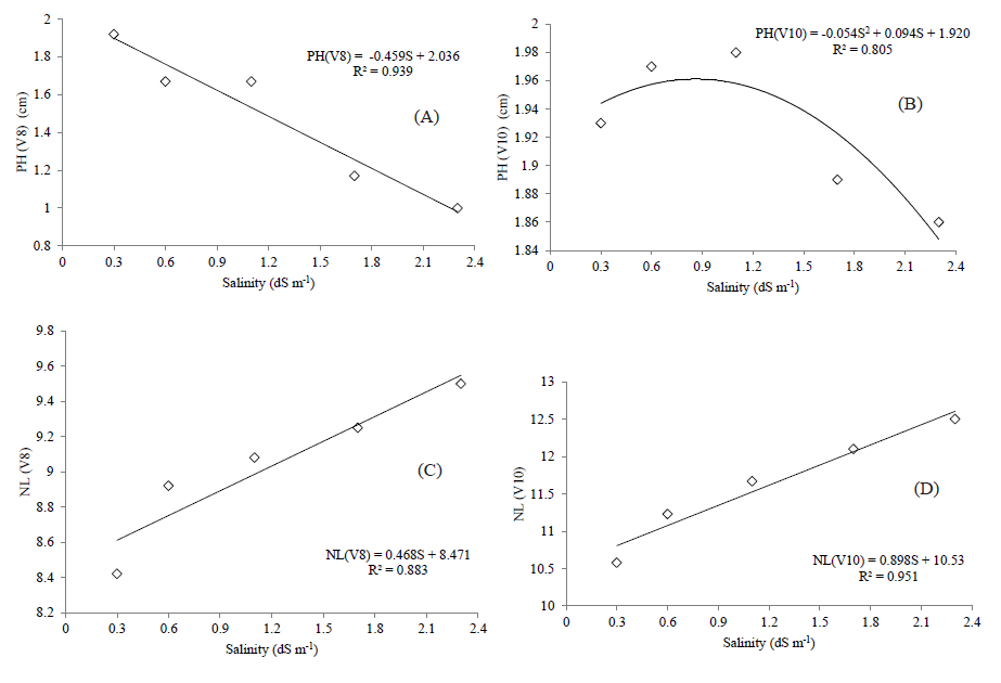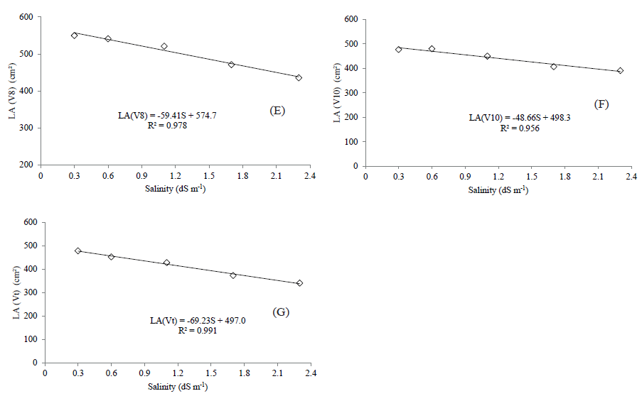 Although the number of leaves was higher in treatments with a high water electrical conductivity level, the leaf area faced a linear reduction with the increase in salinity (Figures 1E, 1F and 1G), which may be related to the lesser development of the leaf blade, resulting in a leaf with short length and width. Souza et al. (2014) and Ricardi & Rosa (2018) studied the effect of salinity on maize development and noticed a decrease in plant height, number of leaves, stem diameter and leaf area due to the increase in salinity levels, not corroborating, partially, the results obtained in this research.