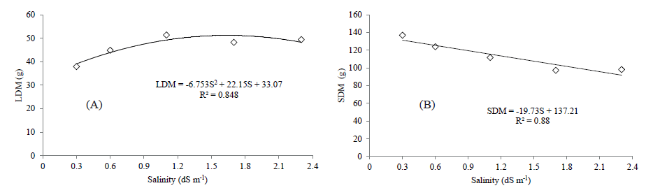 The leaf dry mass showed a quadratic increase of 30.2 % with the increase in the levels of water electrical conductivity, varying between 37.94 g (0.3 dS m-1) and 49.50 g (2.3 dS m-1) (Figure 2A). The stem dry mass had a linear reduction as the levels of salts in the irrigation water increased (Figure 2B), with average values between the water electrical conductivity of 0.3 dS m-1 and 2.3 dS m-1, ranging from 136.83 g to 98.09 g, respectively.