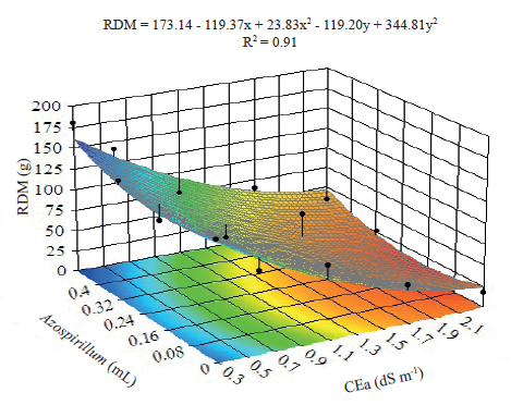 3. There is an interaction between the levels of electrical conductivity of the irrigation water and the A. brasilense doses for root dry mass, with an increase for root dry mass due to the increase of the bacterial inoculant doses;