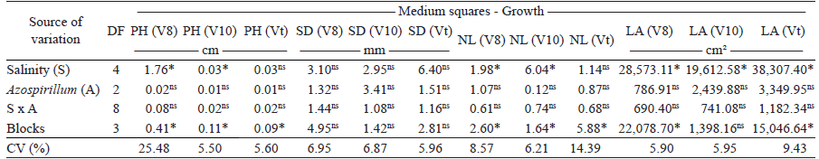 During the growth assessments (Table 1), a significant effect of the salinity factor was identified in the first two assessments for plant height (V8 and V10), with significance of p < 5 % for the Azospirillum factor and for the interaction salinity x Azospirillum. There was no effect (p < 5 %) of the analyzed factors on the stem diameter. The number of leaves was significantly affected by the salinity in the evaluations at V8 and V10, while the leaf area suffered the effect of this isolated factor in all evaluations. Statistically, the number of leaves and leaf area were not significant at 5 % of probability for the Azospirillum factor and for the interaction salinity x Azospirillum.